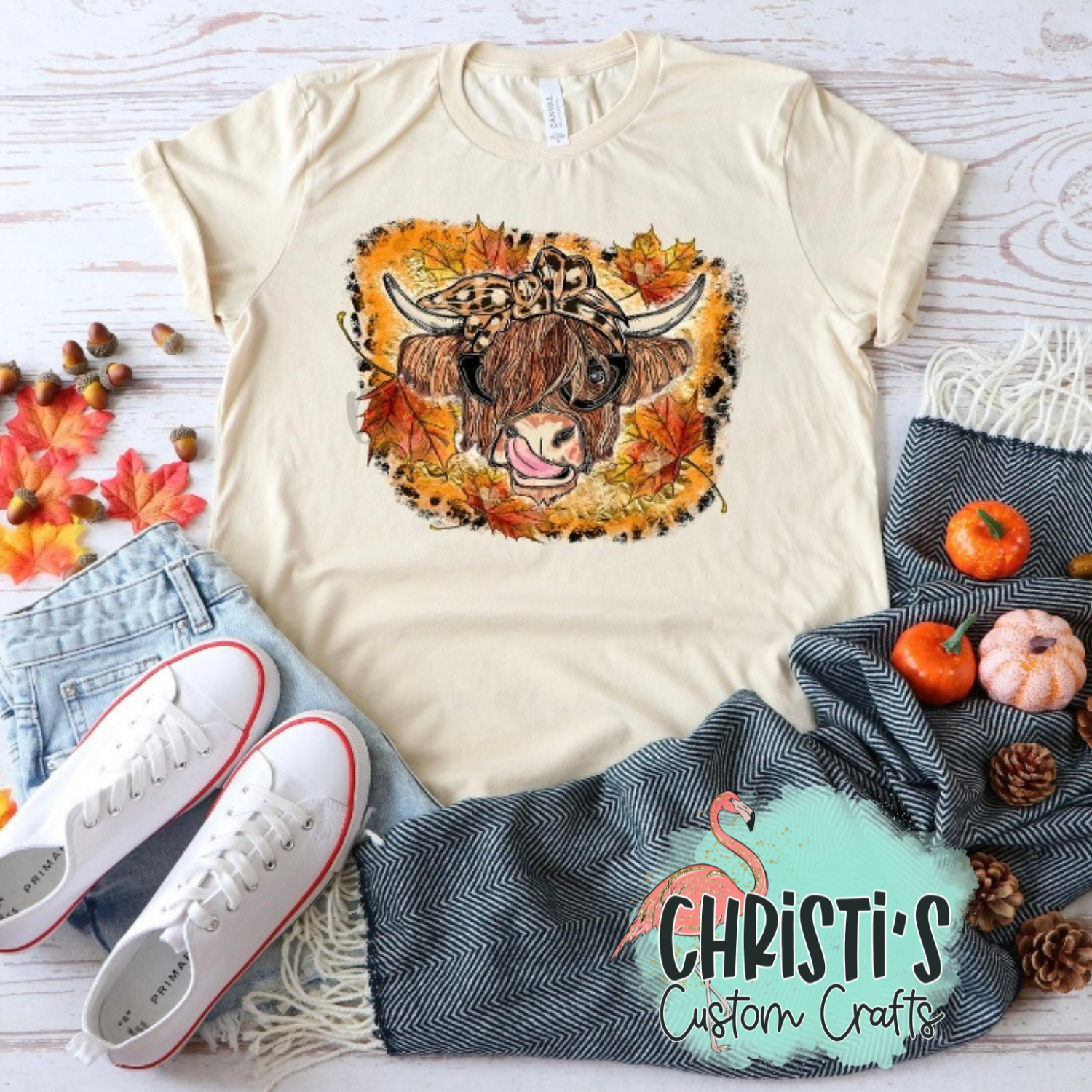 Fall leaves Highland Cow with leopard bow